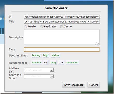 The Diigo Chrome Extension Bookmark tool allows users to bookmark a page with the click of the button. As you can see below, it gives users a dialogue box which allows them to either share the bookmark or keep it private. They can write a brief description of the site being bookmarked, and can add tags for easier search access. They can also add the bookmark to their personal bookmark lists and share it with one of the groups to which they belong. The Chrome Extension Bookmark Tool is now an integral part of my web reading because it makes so easy to bookmark resources.